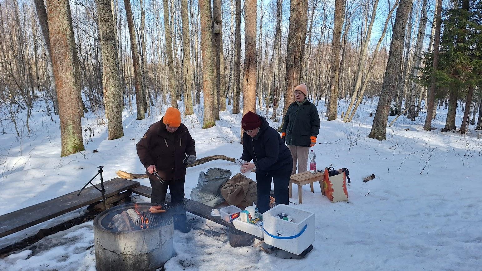 Polut olivat osittain jäisiä ja nastakengät olivatkin hyvä valinta. Sopivan reitin valitsemalla saatoimme kuitenkin tehdä turvallisen kierroksen alueella ennen grillimakkaran ja kahvin nauttimista.