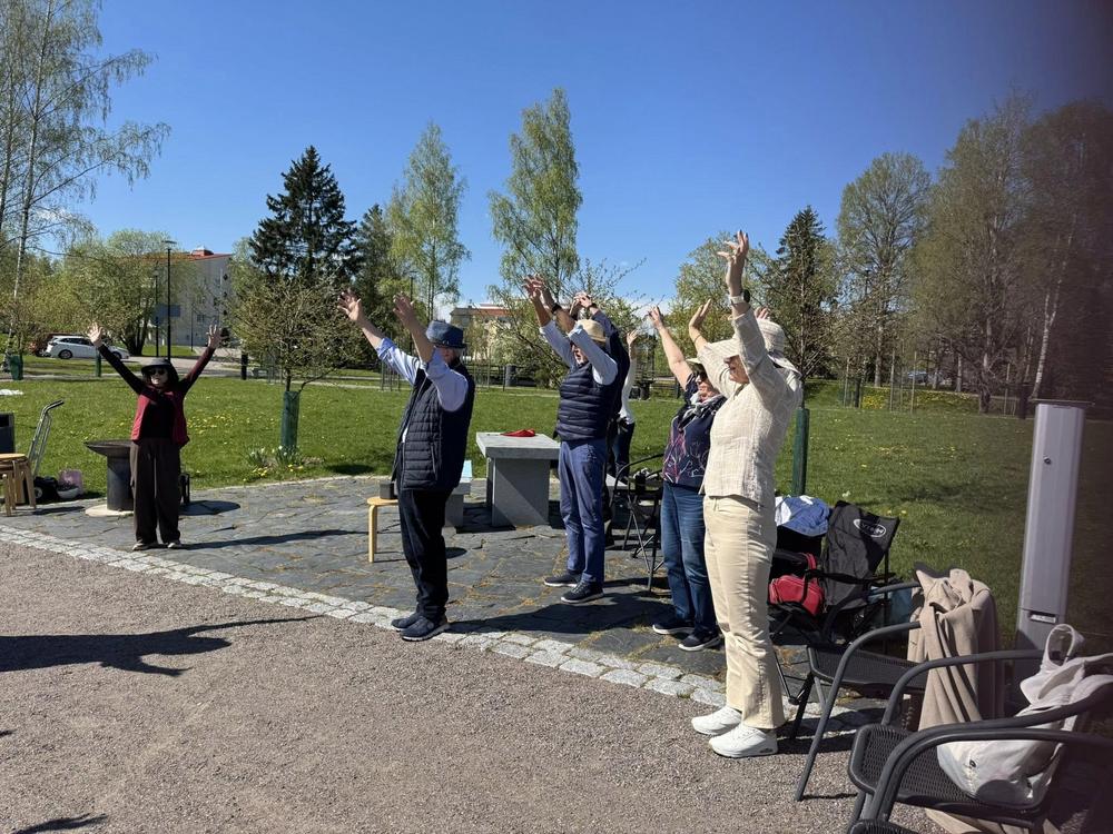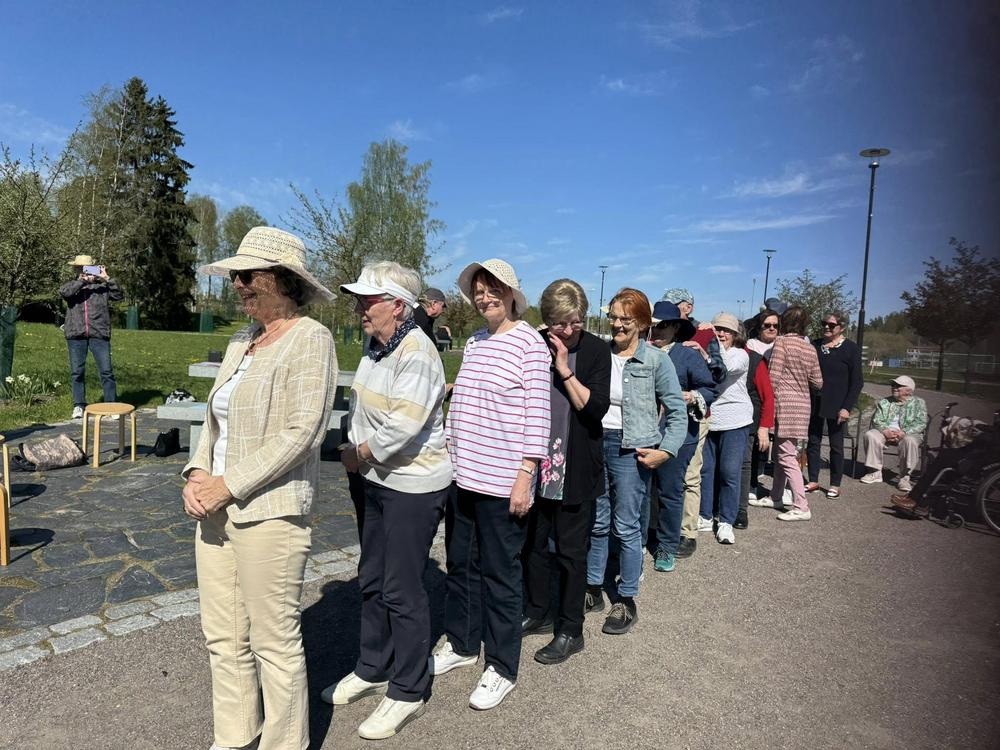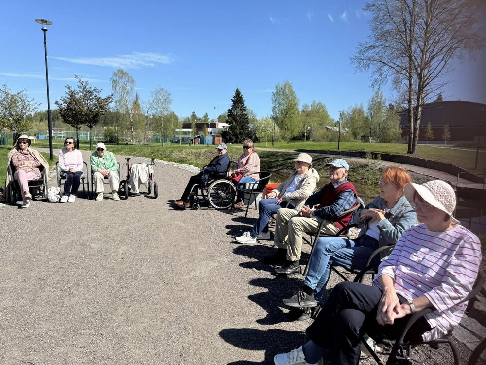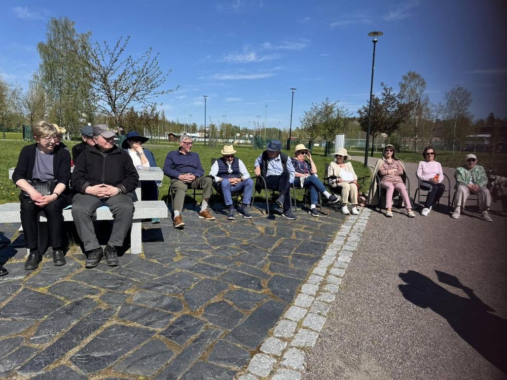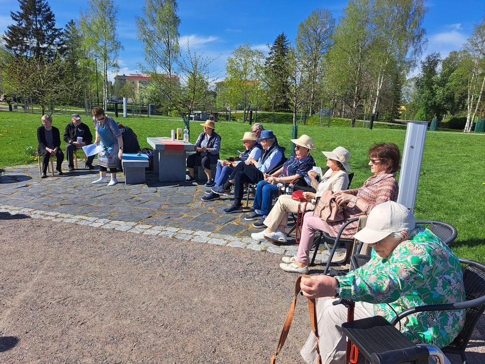 Muistikerho kokoontui kevätkauden viimeiseen tapaamiseen . Mäntsälän viehättävään kirsikkapuistoon. Pukeutumiskoodiksi oli saatu hattu tai muu näyttävä päähine, mikä olikin tarpeen auringonpaisteessa. Ohjaaja Liisa oli miehensä Markun kanssa roudannut paikalle istuimet kaikille.