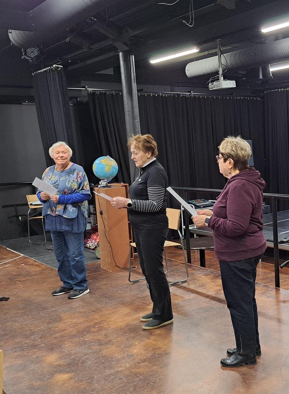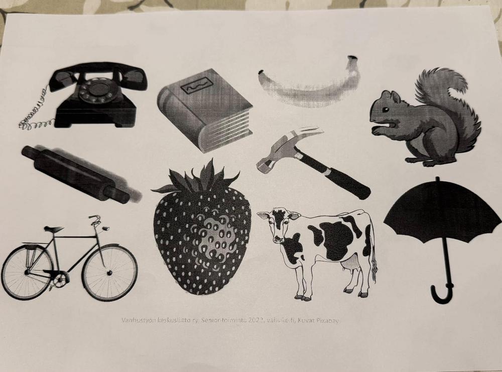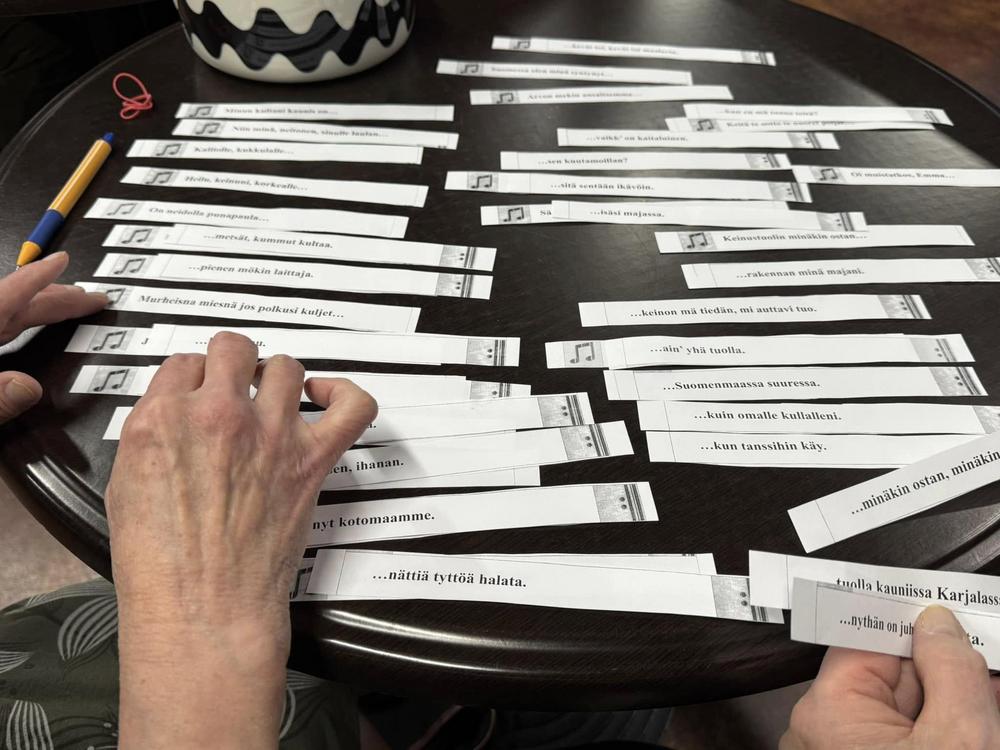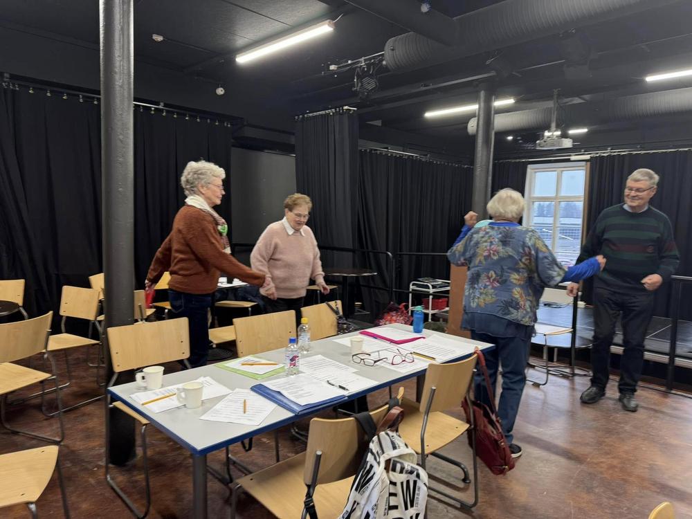 Kerhotehtävinä oli kuvamuistiharjoituksia, rimmaavia arvoituksia ja kansanlauluvisa. Välillä notkistettiin niveliä ja heiluteltiin raajoja Caritan ohjaamassa tuolijumpassa.
