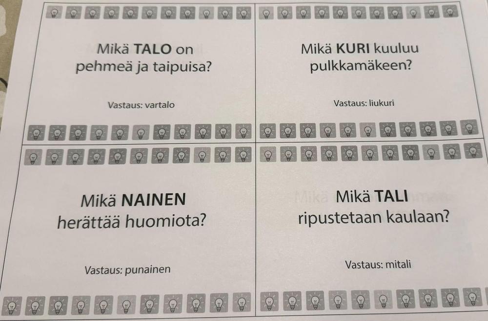 Sitten siirryttiin tehtävien pariin. Ensimmäiseksi tehtiin matematiikan mystisiin lainalaisuuksiin liittyvä tehtävä. Tämän jälkeen siirryttiin kirjallisiin tehtäviin. Oli useita tietovisoja, joita ratkottiin pöytäkunnittain, samoin sananmuodostusta tavujen avulla. Yksin kukin etsi synonyymejä ja yhdisteli sekaisin menneistä tavuista sanoja.