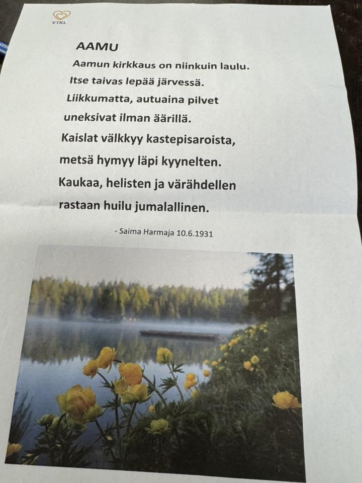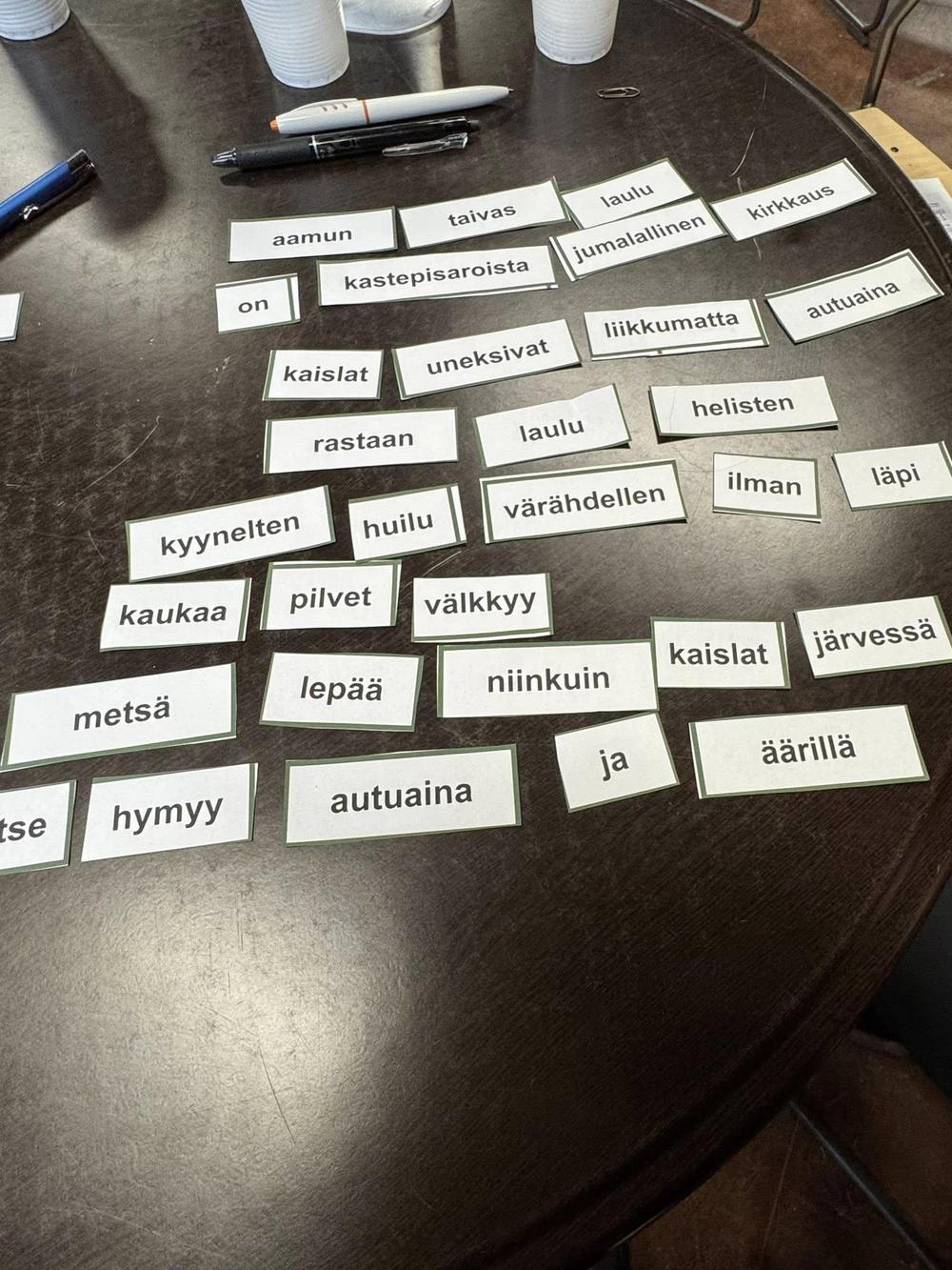Saimme päästää luovuutemme valloilleen. Carita oli jakanut jokaiseen pöytään Saima Harmajan runon Aamu sekä kirjekuoren. Kuoressa oli tämän runon jokainen sana leikattuna erillisille lappusille. Niistä meidän tuli, luovuuttamme käyttäen, muodostaa uusi runo.