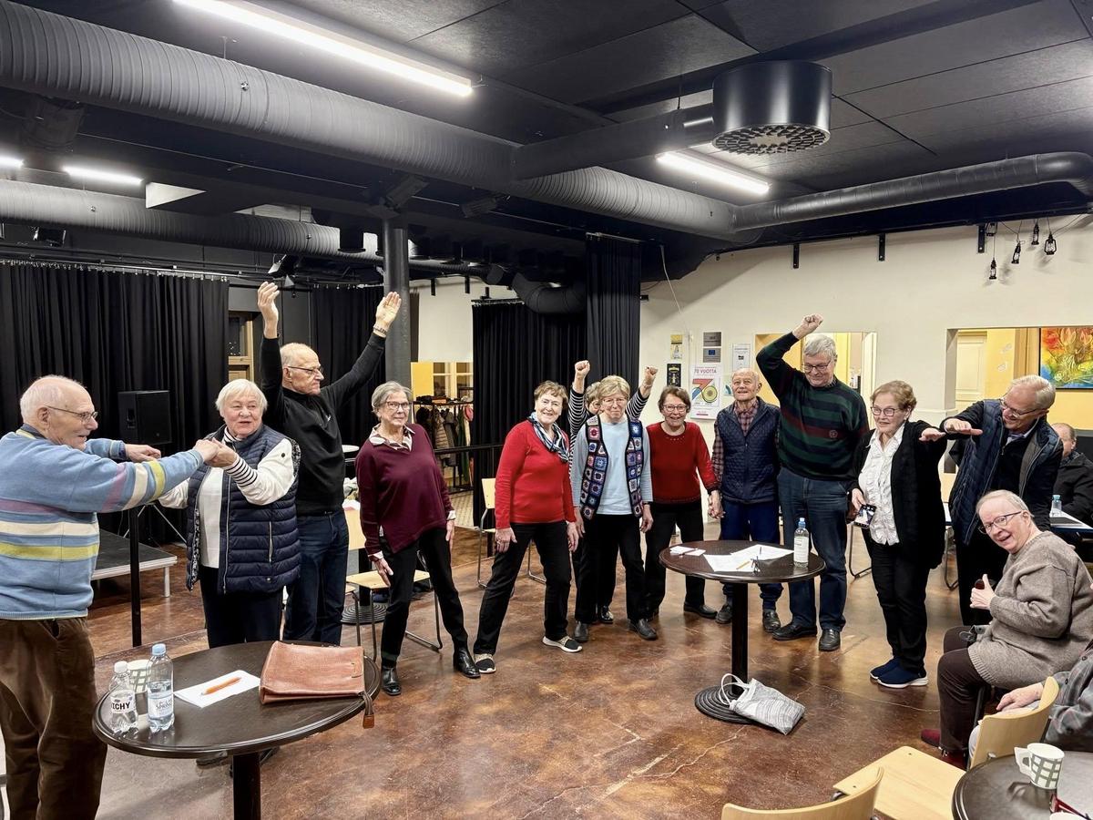 Välillä laulettiin ja sitten noustiin liikkumaan. Koska muistikerho on aina ”ajan hermolla”, oli liikuntamusiikkina KAJ:n hittibiisi Bara Bada Bastu.