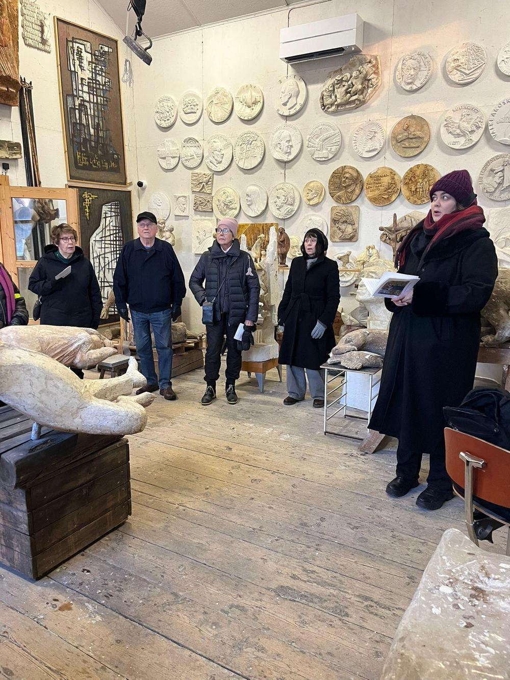 Museo- ja sauvakävelykerhon yhteinen kierros Mäntsälän 440-juhlavuoden kulttuuripolulla keskiviikkona 19.11.2025 alkoi kirpeässä pakkassäässä Heikki Varjan ateljeesta. Riikka Sipilä kunnan kulttuuritoimesta tutustutti meidät taiteilijan työskentely-ympäristöön ja hänen tuotantonsa keskeisiin teemoihin. Ateljeessa on esillä luonnoksia, kipsivaluja sekä valmiita töitä hänen eri uravaiheistaan.