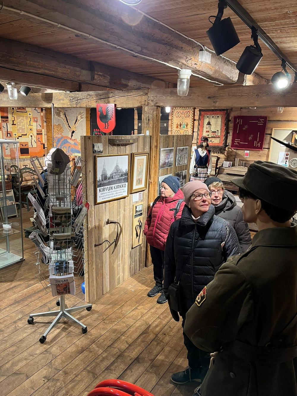 Seuraavaksi Kirvunmuseon ovet meille avasi sukujuuriltaan kirvulainen ja Kirvu-Säätiön hallintoneuvoston entinen puheenjohtaja Seppo Rautama. Kirvun Pitäjämuseo on perustettu 1985 Mäntsälässä pidettyjen Kirvun kihujen yhteydessä. Museo on täynnä esineitä, jotka kertovat evakkojen tarinoita, ne on tuotu Karjalan kannakselta evakkokuormissa. Seppo kertoi esineiden taustoista, käyttötavoista sekä kirvulaisuuden perinteestä.