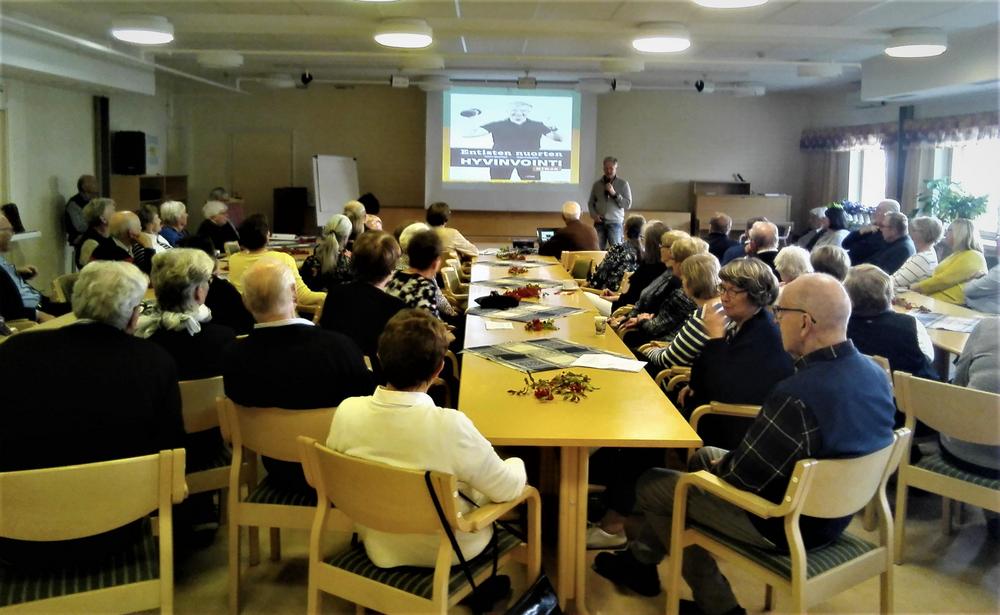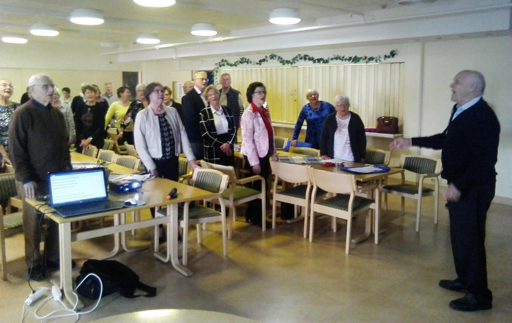 Kuukausikokous 19.9.2019. Arvo Räsänen yhteislaulattaa osallistujia.