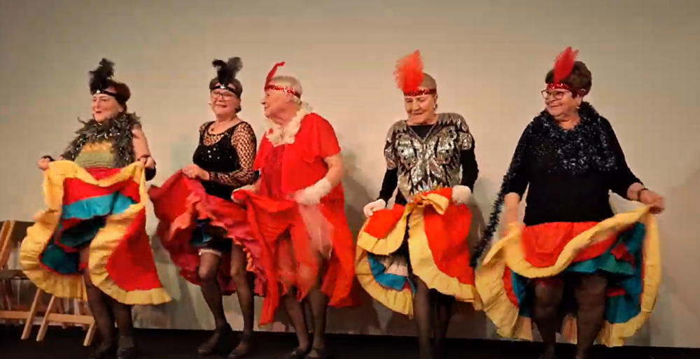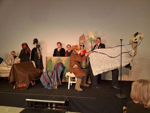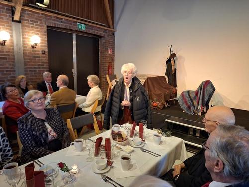 Lounaan jälkeen laulettiin useammassa otteessa yhteislauluja ja niiden välillä oli pari elävää esitystä. Ensin Tuulikki Tilsalan ohjaamana valmisteltu joulukuvaelma ” Joulukirkkoon”, joka rakentui tutun joululaulun ” Kello löi jo viisi, lapset herätkää… ” varaan. Yllätysnumerona saimme vielä nähdä viiden ikinuoren cancan-tytön cabaret-esityksen ennen kahvittelua.