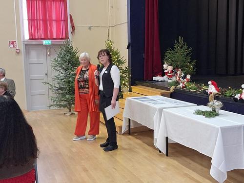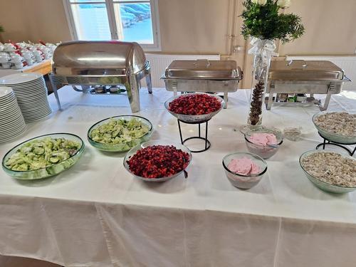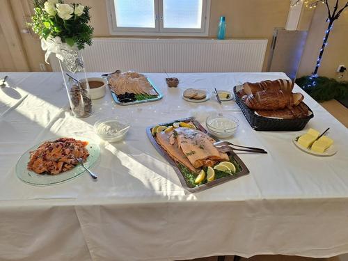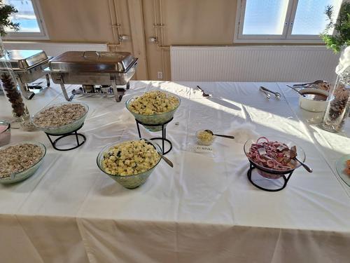 Tänä vuonna nautimme joululounasta Seurojentalolla, jonne juhlan toimikunta oli luonut lämmintä joulun tuntua aitojen kuusien, jouluvalojen, joulukoristeiden ja kaikkialta kurkistelevien pikku tonttujen avulla. Maittavan joululounaan meille oli valmistanut ja tarjoili Catyas Catering.