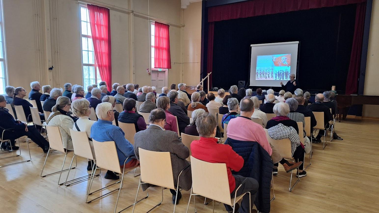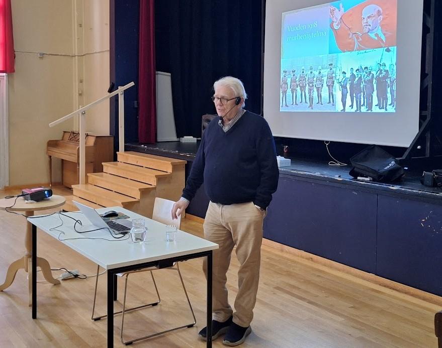 Lehtinen kävi kirjansa pohjalta läpi historiallisia läheltä piti-hetkiä, joissa Suomen kansan, maan tai demokratian kohtalo oli vaakalaudalla ja joissa lopputulos olisi voinut olla toisinkin. Onnistuneesta päätöksenteosta, osaamisesta tai jopa tuurista johtuen olemme kuitenkin tänään siinä missä olemme. Lehtinen piti vauhdikkaalla ja huumorin sävyttämällä esityksellään yli 80-päisen kuulijakunnan huomion hallussaan ja esityksen aikana ei syntynyt pienintäkään kuollutta hetkeä. Tilaisuus ei ollut mitään kuivaa historiallisten tapahtumien luettelointia vaan elävää ja värikäastä kerrontaa tapahtumista, niiden taustoista, ihmisistä, päätöksenteosta ja vaihtoehtoisista skenaarioista.