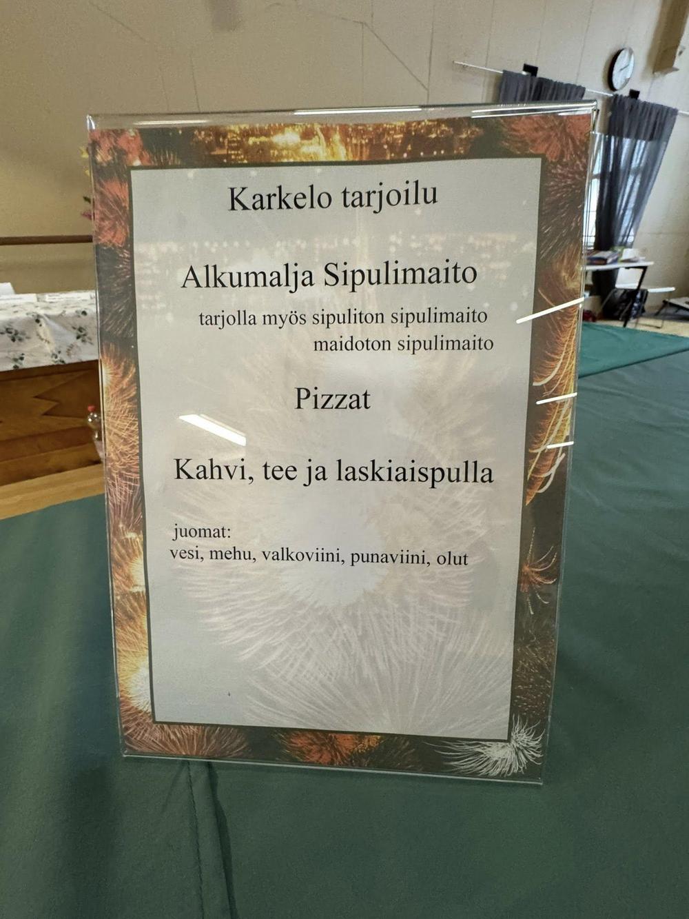 Paikalliselta yrittäjältä tilatut lämpimät pitsat oli emäntien toimesta aseteltu valmiiksi pilkottuina tarjolle. Valinnanvaraa riitti joka makuun, ja pitsaa sai syödä kyllikseen – sitä jäi jopa mukaan ostettavaksi kotiin vietäväksi.