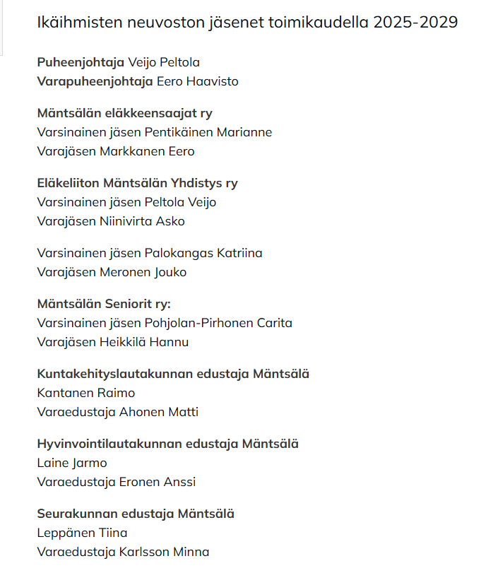 Alla on Ikäihmisten neuvoston jäsenet toimikaudella 2025-2029. Klikkaamalla kuvaa saat sen luettavampaan muotoon.